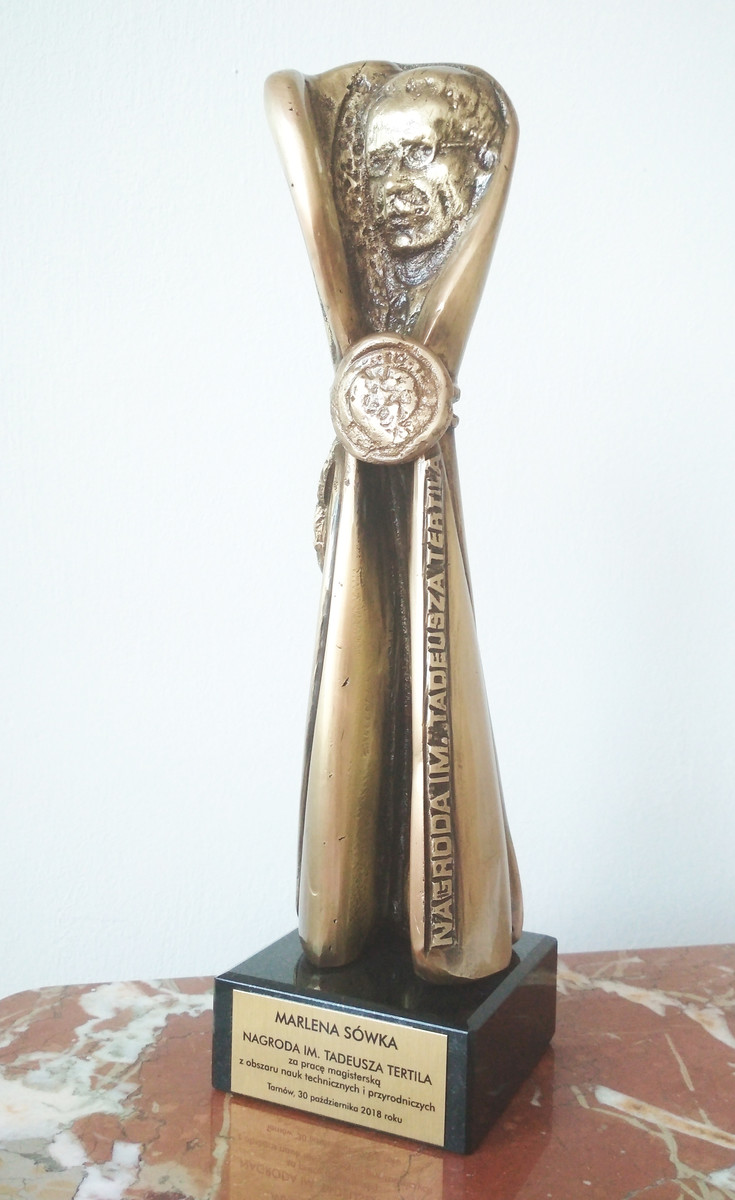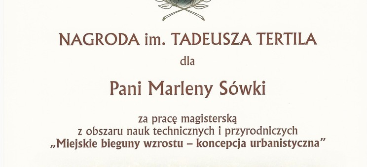 Marlena Sówka, absolwentka kierunku Architektura na Wydziale Budownictwa, Inżynierii Środowiska i Architektury otrzymała Nagrodę Tertila za najlepszą pracę magisterską z obszaru nauk techniczno-przyrodniczych o tematyce związanej z Tarnowem lub powiatem tarnowskim. Zwycięska praca dyplomowa dotyczyła przekształceń struktury miejskiej Tarnowa i nosiła tytuł “Miejskie bieguny wzrostu - koncepcja urbanistyczna”. Promotorem pracy była dr inż. arch. Anna Sikora z Zakładu Urbanistyki i Architektury. Nagrody wręczono podczas uroczystej, wspólnej sesji Rady Miejskiej w Tarnowie i Rady Powiatu Tarnowskiego z okazji 100-lecia odzyskania niepodległości przez Polskę.