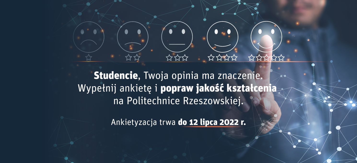 Zgodnie z Zarządzeniem nr 5/2021 Rektora Politechniki Rzeszowskiej w sprawie trybu i zasad przeprowadzania ankietyzacji i hospitacji zajęć dydaktycznych z późn. zm. w porozumieniu z Samorządem Studenckim i Samorządem Doktorantów został ustalony termin udostępniania formularzy ankiet w systemie USOS-web w semestrze letnim roku akademickiego 2021/2022 w okresie od 22 czerwca 2022 r. do 12 lipca 2022 r. (sesja zasadnicza i poprawkowa).