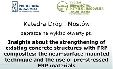 Katedra Dróg i Mostów zaprasza na otwarty wykład nt. "wzmacniania konstrukcji materiałami kompozytowymi", który wygłosi prof. Jose Sena Cruza z University of Minho z Portugalii.