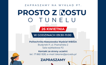 Mostostal Warszawa oraz Biuro Karier Politechniki Rzeszowskiej zapraszają na wykład pt. "Prosto z mostu o tunelu". Wykład odbędzie się w dniu 26 kwietnia 2023 r. w godzinach 9:30 - 11:00 w sali P-2.