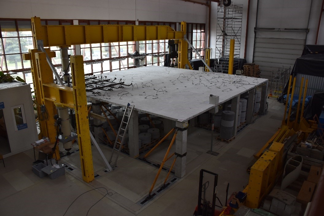 Przedmiotem badań jest strop żelbetowy grubości 8 cm, o wymiarach 9,6m x9,6 m, oparty na 25 słupach. Badania zostały podzielone na trzy etapy, niezbędne do przebudowy systemu obciążania dla każdego etapu. W sumie podczas badań usunięte zostaną cztery słupy: trzy krawędziowe oraz jeden wewnętrzny. Usuniecie słupów poprzedzone jest symulacją (za pomocą obciążników betonowych), możliwych do wystąpienia w rzeczywistym stropie obciążeń stałych i zmiennych. Następnie w miejscu usuwanego słupa realizowane jest dodatkowe obciążenie skupione, odwzorowujące przepływ sił w obiekcie wielokondygnacyjnym, po awarii jednej z podpór. Podczas prowadzonych badań do pomiarów odkształceń betonu i stali wykorzystywane są najnowsze techniki pomiarowe tj. tensometry światłowodowe oraz system optyczny do trójwymiarowego pomiaru odkształceń ARAMIS.