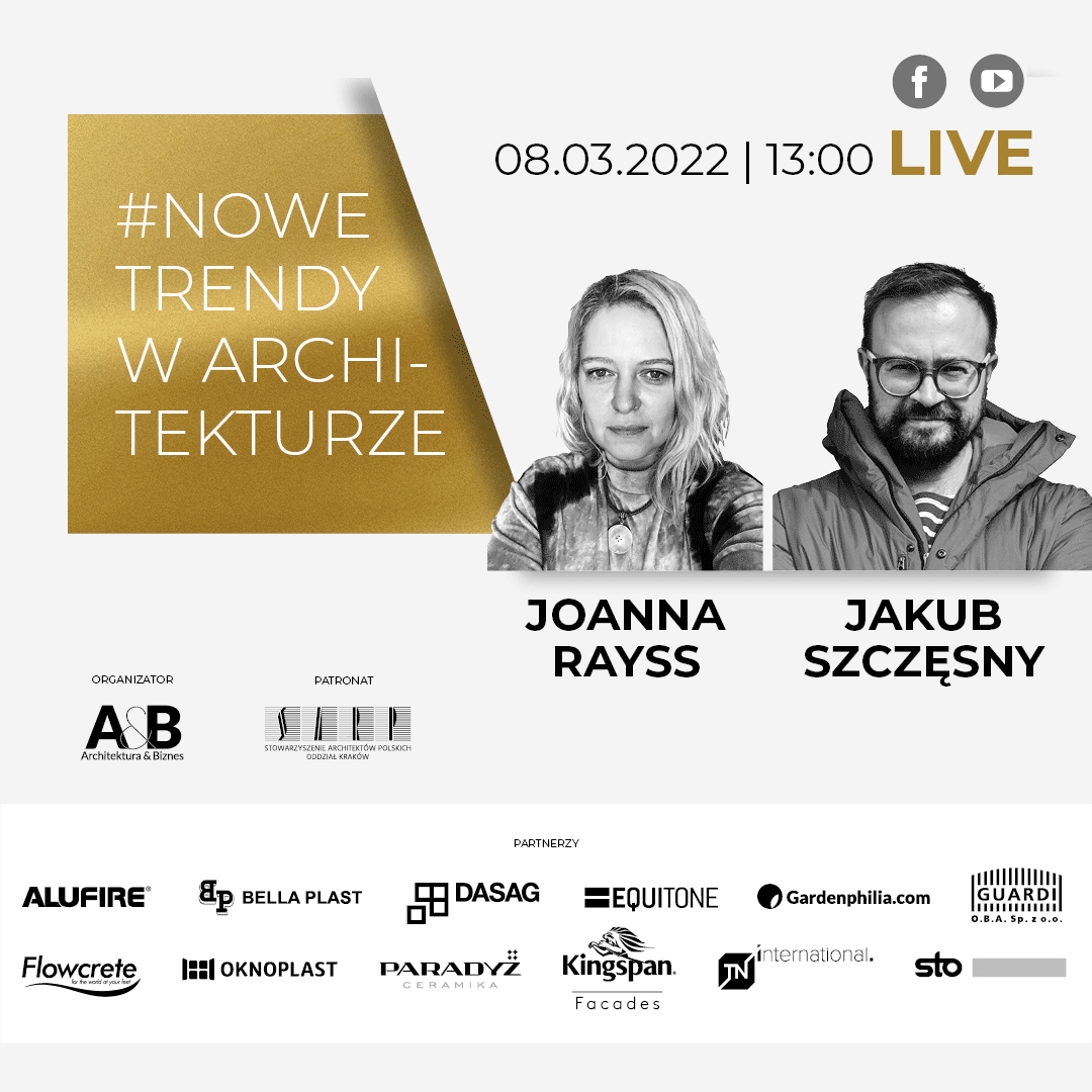Jakie zmiany przyniósł pandemiczny czas? Z jakimi wyzwaniami musimy się mierzyć? Miesięcznik A&B rozpoczyna cykl rozmów LIVE – #NOWE TRENDY W ARCHITEKTURZE z najlepszymi projektantami, którzy na podstawie własnej praktyki projektowej opowiedzą, jak wdrażać zmiany, co one przynoszą i jaki jest ich bilans w zurbanizowanych przestrzeniach. 8.03.2022 o godzinie 13.00 JOANNA RAYSS (Rayss Group) i JAKUB SZCZĘSNY ( (Pracownia Szcz)