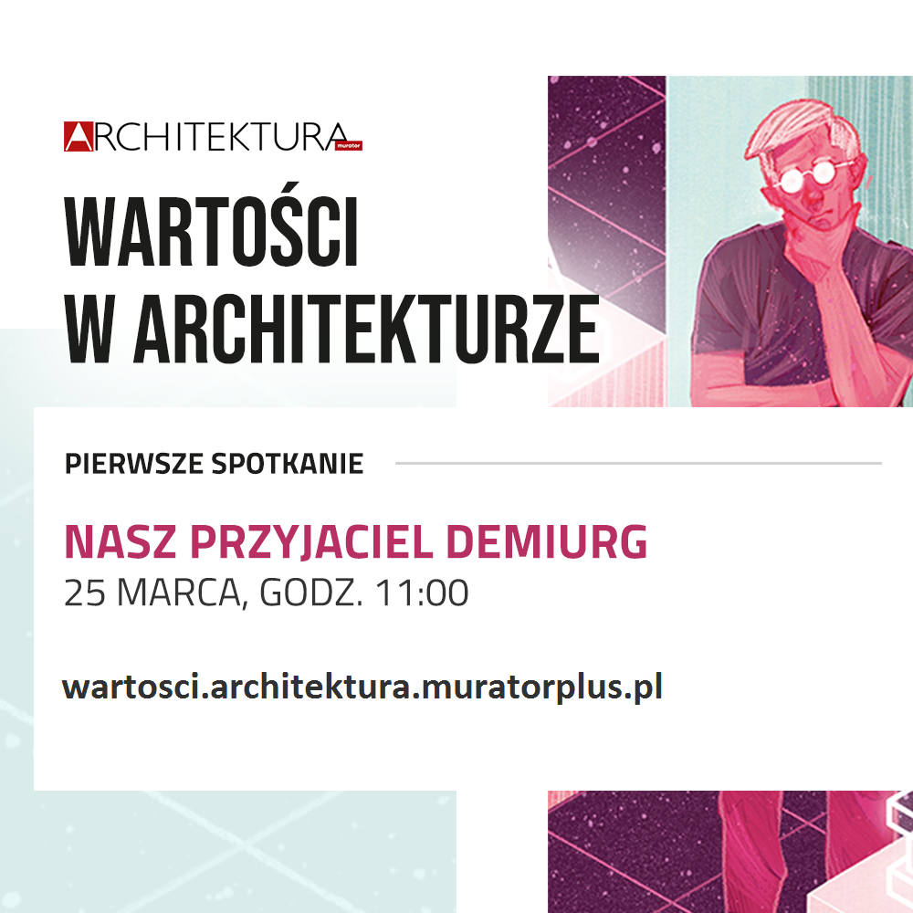 Pierwsze spotkanie dotyczące cyklu spotkań online z wybitnymi twórcami polskiej architektury, zainicjowanego przez miesięcznik Architektura – murator wraz z serwisem architektura.murator.pl pod tytułem „Nasz przyjaciel demiurg” odbędzie się 25 marca o godzinie 11.00 w siedzibie firmy APA przy ul. Kamionkowskiej 32 w Warszawie. Całość będzie transmitowana online na stronie: wartosci.architektura.muratorplus.pl