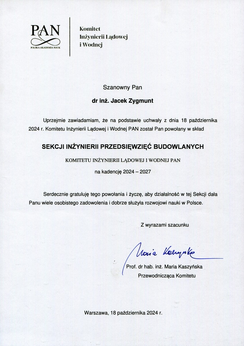 Dr inż. Jacek Zygmunt należy do Sekcji od 2012 roku, obecnie czwartą kadencję. W ZIMiTB zajmuje się tematyką m.in. technologii i zarządzania w budownictwie.