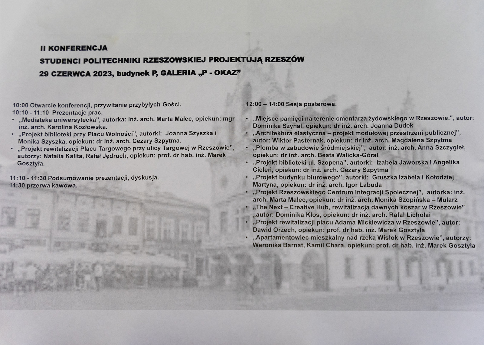 W dniu 29 czerwca 2023 roku, z inicjatywy Wydziału Budownictwa, Inżynierii Środowiska i Architektury Politechniki Rzeszowskiej w budynku P Politechniki Rzeszowskiej, w galerii „P-Okaz” odbyła się Druga Konferencja "Studenci Politechniki Rzeszowskiej projektują Rzeszów".