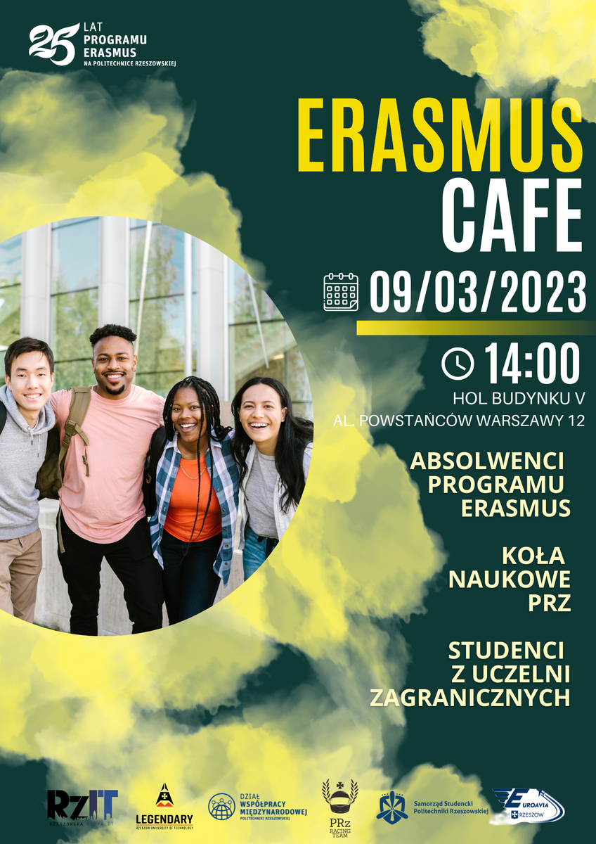 Dział Współpracy Międzynarodowej PRz zaprasza na Erasmus Cafe, wydarzenie skierowane do studentów zainteresowanych wyjazdem na Erasmusa. Spotkanie odbędzie się 9 marca 2023 r. w holu budynku V, przed salą V-1 w godzinach od 14:00 do 16:00.
