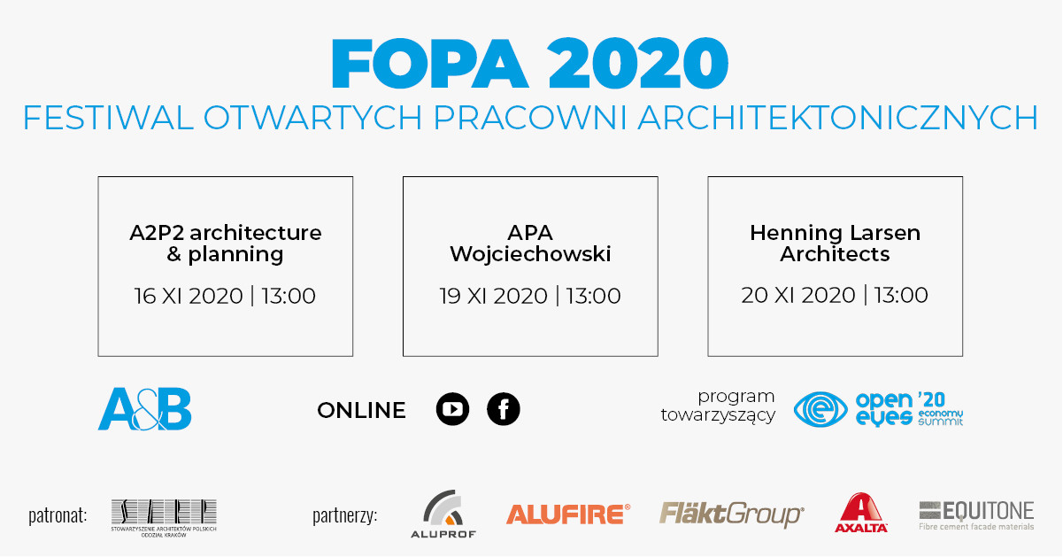 Serdecznie zapraszamy na FESTIWAL OTWARTYCH PRACOWNI ARCHITEKTONICZNYCH (FOPA) 16-20 listopada 2020, który jest wydarzeniem towarzyszącym kongresu Open Eyes Economy Summit*. Festiwal skierowany jest do architektów, projektantów, studentów architektury, ludzi zainteresowanych tematyką architektury.To 3 dni spotkań, podczas których uczestnicy będą mieli okazję poznać ciekawych architektów z najlepszych biur w ich codziennym środowisku pracy, przyjrzeć się ich metodzie projektowej, zobaczyć modele, projekty, zdjęcia.