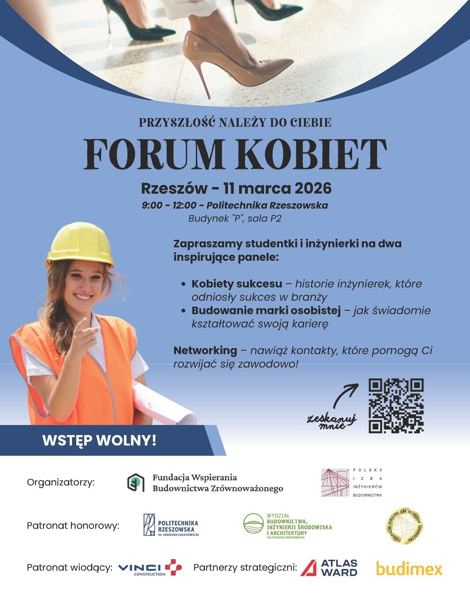 Serdecznie zapraszamy do udziału w Forum Kobiet 2026 - RZESZÓW, którego Politechnika Rzeszowska im. Ignacego Łukasiewicza i Wydział Budownictwa, Inżynierii Środowiska i Architektury są patronami honorowymi.