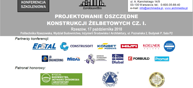 Konferencja szkoleniowa "Projektowanie oszczędne konstrukcji żelbetowych cz. I" odbędzie się 17 października 2018 r. w Rzeszowie na Wydziale Budownictwa, Inżynierii Środowiska i Architektury przy ul. Poznańskiej 2, w Budynku P, w sali P2.