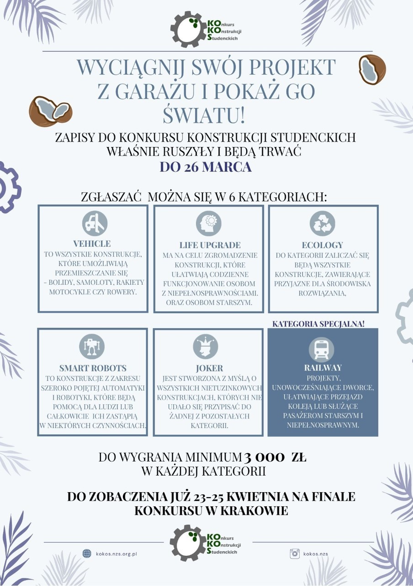 Finalistów zaprosimy na pokaz konstrukcji oraz Galę Finałową, które odbędą się 23-25 kwietnia na Akademii Górniczo-Hutniczej w Krakowie. Szczegółowe informacje na temat wydarzenia dostępne są w naszych social mediach, więc obserwuj nas na Facebooku (https://www.facebook.com/kokos.nzs), a na pewno nic Cię nie ominie.