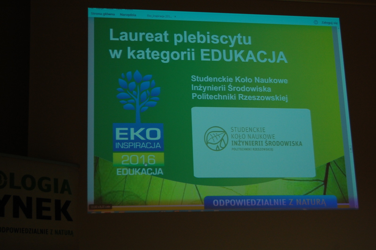 23 marca br. w gmachu Wyższej Szkoły Ekologii i Zarządzania w Warszawie odbyła się gala finałowa ogólnopolskiego programu „Odpowiedzialnie z Naturą”. Podczas uroczystości ogłoszono wyniki plebiscytu „Eko-Inspiracja 2016” w kategorii „edukacja”. Laureatem zostało Studenckie Koło Naukowe Inżynierii Środowiska PRz z Wydziału Budownictwa, Inżynierii Środowiska i Architektury. Nagrodę odebrali Beata Kokoszka, przewodnicząca koła naukowego, i dr inż. Adam Masłoń, opiekun koła (Zakład Inżynierii i Chemii Środowiska).