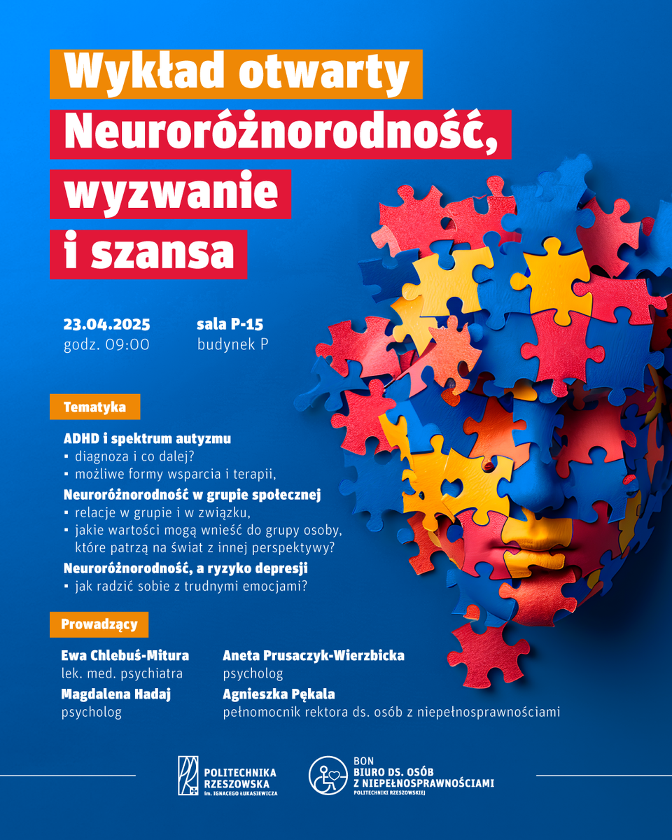 Biuro ds. Osób z Niepełnosprawnościami serdecznie zaprasza do udziału w otwartym wykładzie pt. "Neuroróżnorodność, wyzwanie i szansa", który odbędzie się w dniu 23.04.2025 r. (środa) w godzinach 9:00-10:30 w sali P.15 w budynku P.