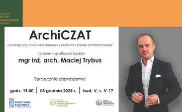 Studenckie Koło Naukowe Architektury Miejsc Społecznych zaprasza w 3 grudnia 2024r. na kolejne spotkanie z cyklu wydarzeń ArchiCZAT - cykliczne studenckie rozmowy z osobami z branży architektonicznej.
