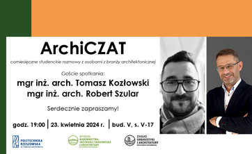 Studenckie Koło Architektury Miejsc Społecznych zaprasza w dniu 23. kwietnia 2024r. na kolejne spotkanie z cyklu wydarzeń ArchiCZAT - cykliczne studenckie rozmowy z osobami z branży architektonicznej.