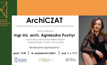 Koło Naukowe Architektury Miejsc Społecznych zaprasza na kolejne spotkanie z cyklu wydarzeń ArchiCZAT - cykliczne studenckie rozmowy z osobami z branży architektonicznej.