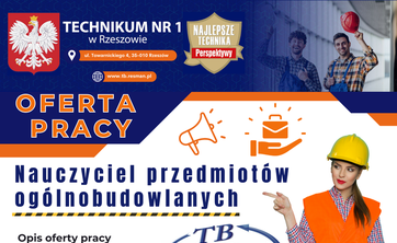 Technikum Nr 1 w Rzeszowie poszukuje kandydatów na stanowiska nauczyciela przedmiotów ogólnobudowlanych oraz nauczyciela przedmiotów instalacyjnych budowlanych.
