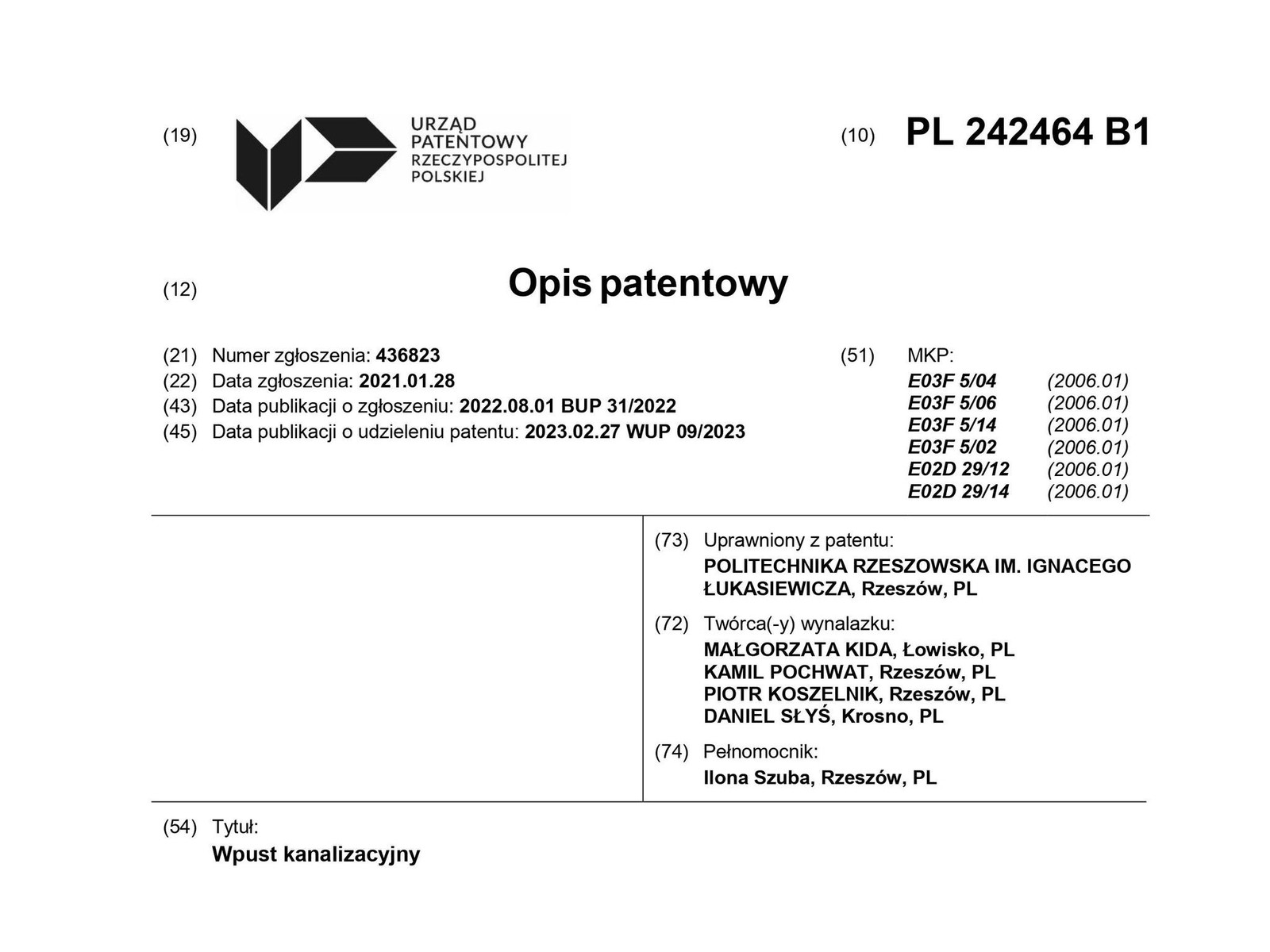 patentu nr P.242464 na wynalazek pt. „Wpust kanalizacyjny”.Twórcami wynalazku są prof. dr hab. inż. Piotr Koszelnik i dr inż. Małgorzata Kida z Katedry Inżynierii i Chemii Środowiska oraz prof. dr hab. inż. Daniel Słyś i dr inż. Kamil Pochwat z Katedry Infrastruktury i Gospodarki Wodnej.