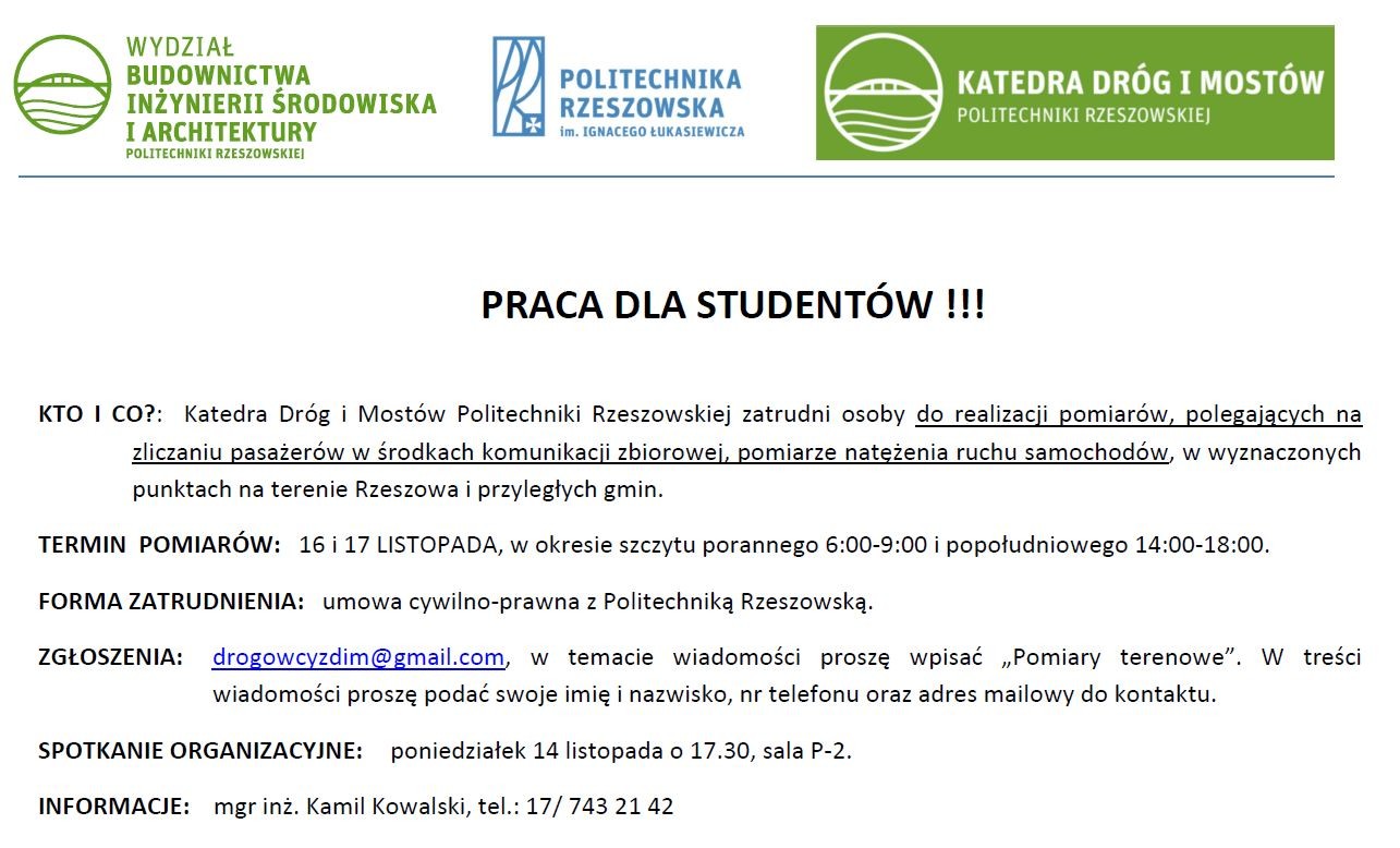 Katedra Dróg i Mostów Politechniki Rzeszowskiej zatrudni osoby do realizacji pomiarów, polegających na zliczaniu pasażerów w środkach komunikacji zbiorowej, pomiarze natężenia ruchu samochodów, w wyznaczonych punktach na terenie Rzeszowa i przyległych gmin.
