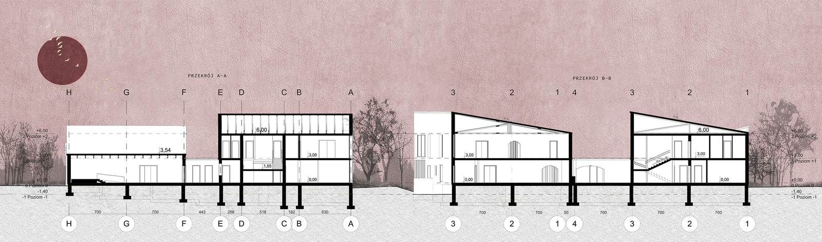 Celem projektu było wykreowanie przestrzeni nastawionej na działalność kulturalną przeznaczoną dla seniorów. Założenie zakładało powstanie bryły o minimalistycznej formie, dostosowanej do potrzeb osób starszych pod względem funkcjonalnym oraz użytkowym. Droga projektowa Wstępne założenie obejmowało powstanie monolitycznego bloku, rozplanowanego wewnętrznie ze względu na funkcję pomieszczeń. W kolejnej fazie zdecydowano o rozdzieleniu poszczególnych segmentów, aby nadać lekkości założeniu oraz połączeniu ich ażurowym korytarzem. W trzecim etapie kształtowania budynku, ścięto prostopadłościenne klocki dachami jednopołaciowymi, aby ułatwić montaż instalacji fotowoltaicznych oraz nawiązać kształtem do otaczającej zabudowy. Konstrukcja Proponowane rozwiązania konstrukcyjne elementów nośnych obejmują wykonanie ścian w technologii szkieletowej. Do ocieplenia budynku zaproponowano technologię wykorzystania kostek słomy, która pozytywnie wpływa na roczny bilans energetyczny budynku.