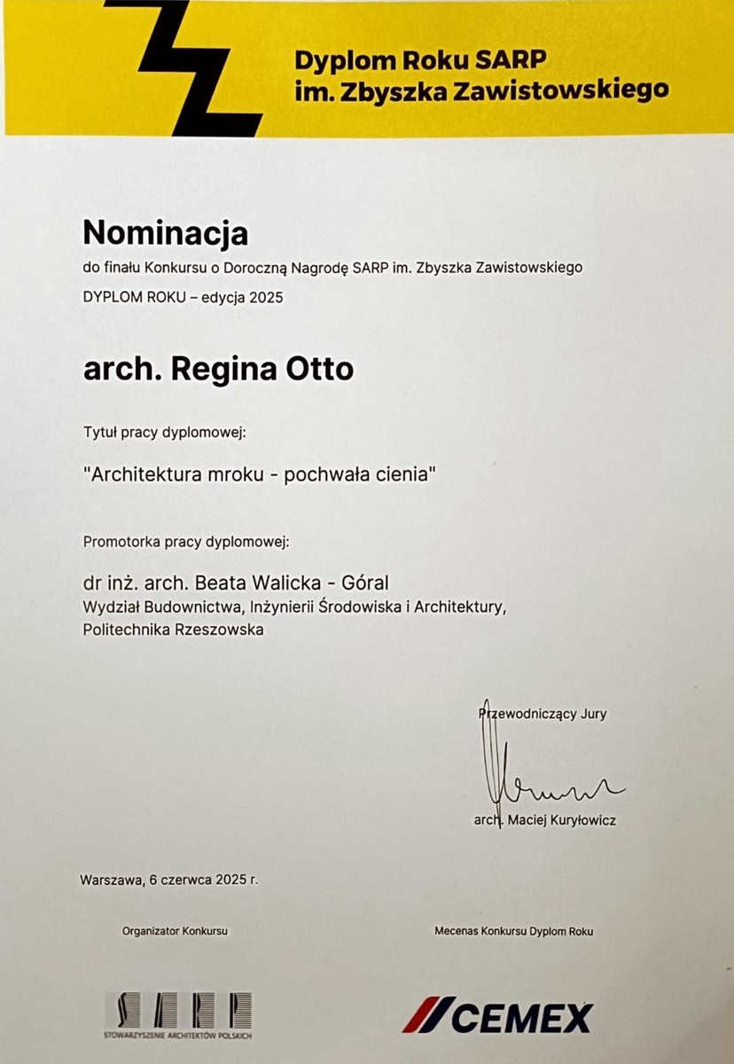 Regina Otto absolwentka studiów magisterskich na kierunku Architektura na Wydziale Budownictwa, Inżynierii Środowiska i Architektury Politechniki Rzeszowskiej znalazła się wśród 22 najlepszych dyplomantów nominowanych do finału ogólnopolskiego konkursu „Dyplom Roku SARP im. Zbyszka Zawistowskiego 2025”. Promotorką pracy jest dr inż. arch. Beata Walicka-Góral z Katedry Urbanistyki i Architektury.