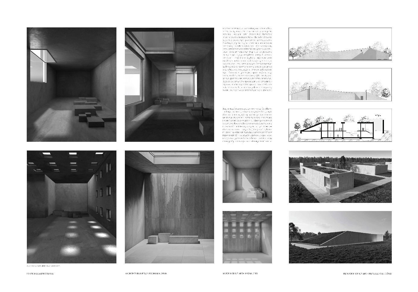 Pochwała cienia w pracy dyplomowej pojmowana jest jako próba stworzenia ośrodka terapeutycznego, w którym osoby zmagające się ze skutkami zdrowotnymi zanieczyszczenia świetlnego oraz zaburzonym biorytmem odnajdują ukojenie w postaci mroku. Mrok w budynku definiowany jest jako niezbędny narracyjny element architektury, a przestrzenie tworzone w zgodzie z naturalnymi wyznacznikami stanowią ostoję dla ludzkości. Ze względu na specyfikę pojmowanego tematu oraz jej wykroczenie poza strefę konkretu projektowa przestrzeń miała również wpływać na odbiorcę tworząc tym samym miejsce eksponowania atmosfery architektury, mającej możliwość wpływu na odczucia odbiorcy. Ulokowanie obiektu w znacznej mierze pod poziomem terenu było celowe, ukazując piękno architektury zatopione w naturalnej ciemności.