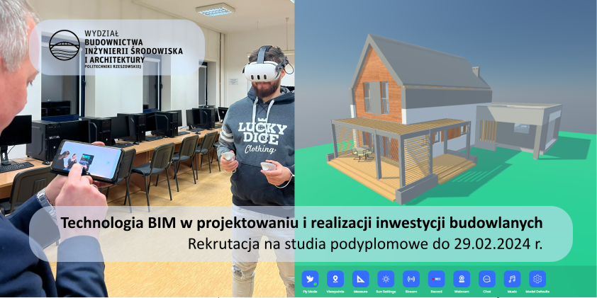 Jeszcze tylko do 29 lutego 2024 r. trwać będzie rekrutacja na kolejną edycję studiów podyplomowych "Technologia BIM w projektowaniu i realizacji inwestycji budowlanych". Zapraszam do zapoznania się z aktualnym planem studiów, galerią zrealizowanych projektów końcowych oraz warunkami rekrutacji. Do uczestniczenia w zajęciach zapraszam osoby z tytułem zawodowym inżyniera oraz studentów i absolwentów studiów magisterskich kierunków architektura, budownictwo, inżynieria środowiska, geodezja. Więcej informacji znaleźć można w Informacjach podstawowych.