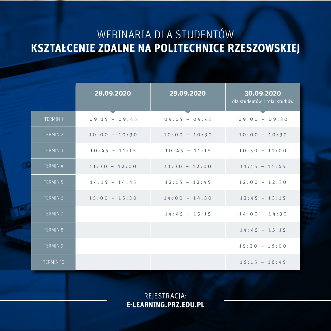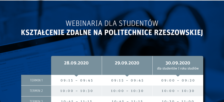 Webinaria prowadzone będą w dniach 28.09.2020r., 29.09.2020r. oraz 30.09.2020r. dla studentów I roku według poniższego harmonogramu.