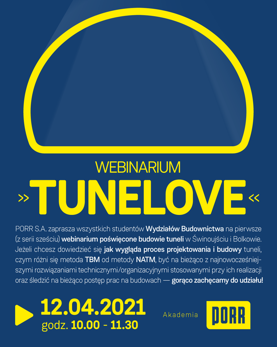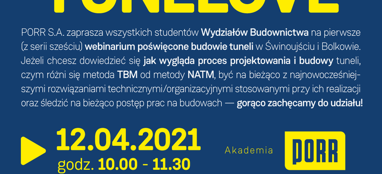 PORR S.A. zaprasza wszystkich studentów Wydziału Budownictwa, Inżynierii Środowiska i Architektury Politechniki Rzeszowskiej na pierwsze (z serii sześciu) webinarium poświęcone budowie tuneli w Świnoujściu i Bolkowie.