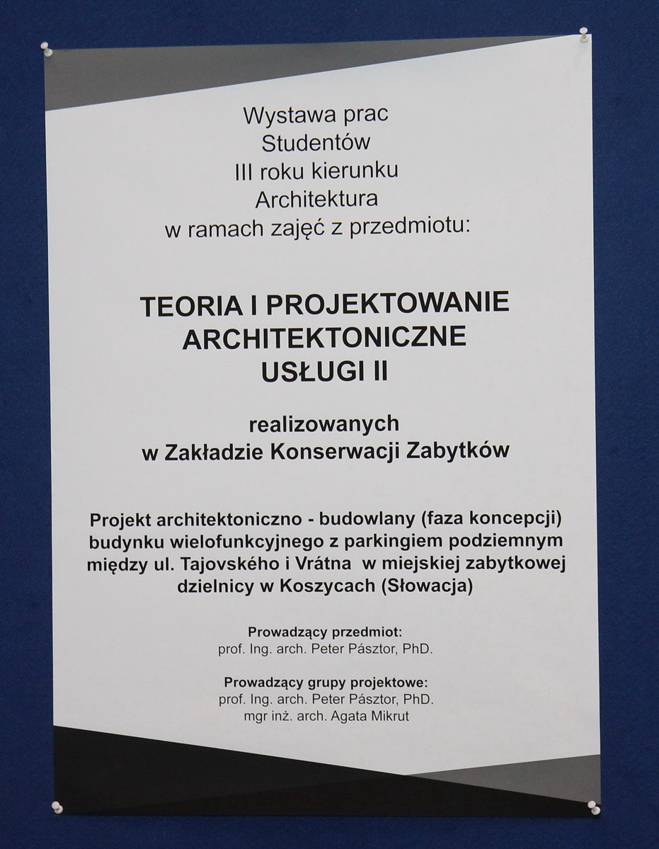 3 lutego br. o godzinie 9:00 w holu głównym Regionalnego Centrum Dydaktyczno-Konferencyjnego i Biblioteczno-Administracyjnego Politechniki Rzeszowskiej otwarto wystawę, na której studenci zaprezentowali swoje koncepcje. Prace przedstawiały projekty architektoniczno-budowlane (faza koncepcji) budynku wielofunkcyjnego z parkingiem podziemnym między ul. Tajovského i Vrátna w miejskiej zabytkowej dzielnicy w Koszycach na Słowacji, opracowywane w zespołach dwuosobowych. Studenci na planszach oraz modelach zaprezentowali różne propozycje architektoniczne projektowanych obiektów. Projekty powstawały pod kierunkiem prof. Petera Pásztora oraz mgr inż. arch. Agaty Mikrut.