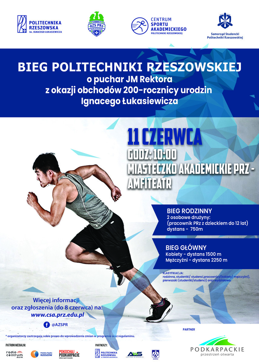 Centrum Sportu Akademickiego/Akademicki Związek Sportowy Politechniki Rzeszowskiej im. Ignacego Łukasiewicza serdecznie zaprasza do udziału w BIEGU POLITECHNIKI RZESZOWSKIEJ z okazji obchodów 200-rocznicy urodzin Ignacego Łukasiewicza, wybitnego Polaka, pioniera przemysłu naftowego, wynalazcy lampy naftowej, założyciela pierwszej na świecie kopalni ropy naftowej. Wielkiego społecznika, inicjatora budowania dróg, mostów, szpitali, szkół a przede wszystkim patrona Politechniki Rzeszowskiej.
