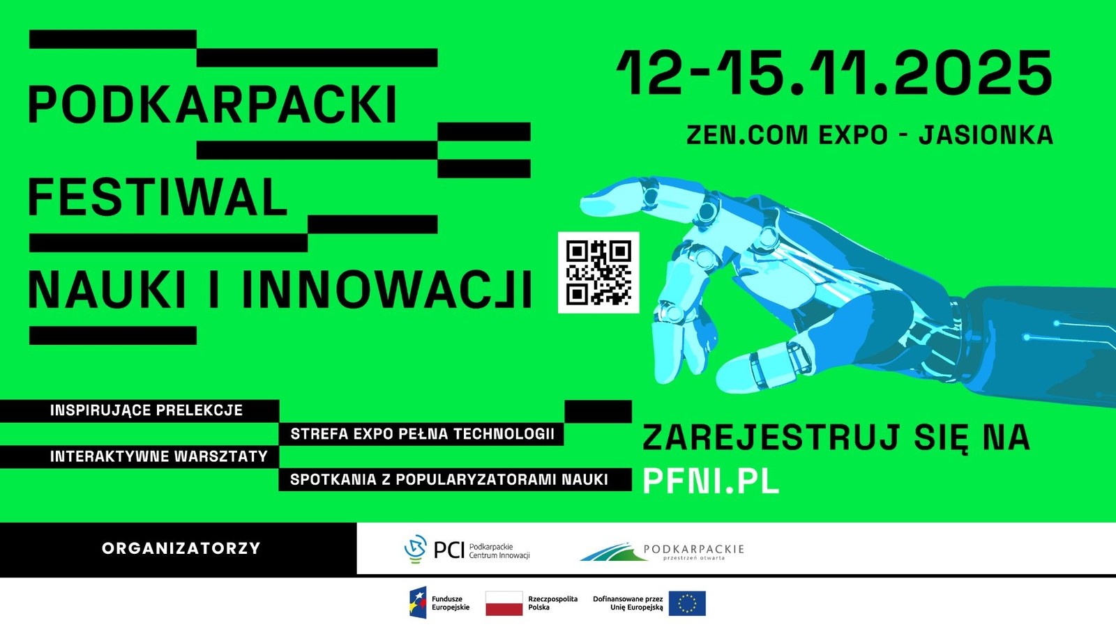 Podkarpackie Centrum Innowacji serdecznie zaprasza studentów Politechniki Rzeszowskiej im Ignacego Łukasiewicza do udziału w Podkarpackim Festiwalu Nauki i Innowacji, który startuje już 12 listopada 2025 r. w Rzeszowie.
