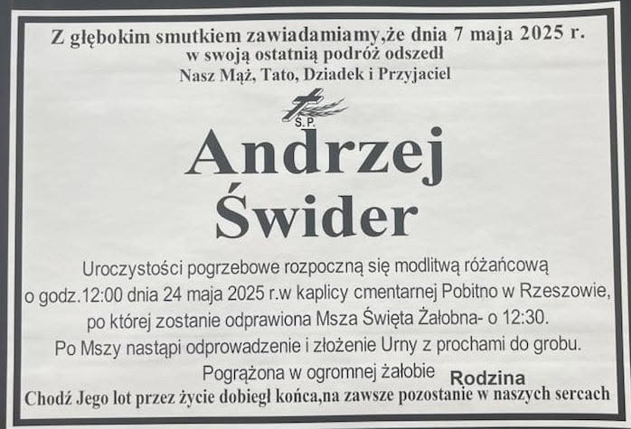 Z głębokim żalem informujemy, że w dniu 7 maja 2025 roku zmarł Pan dr inż. Andrzej Świder, były pracownik Wydziału Budownictwa, Inżynierii Środowiska i Architektury w Katedrze Mechaniki Konstrukcji.