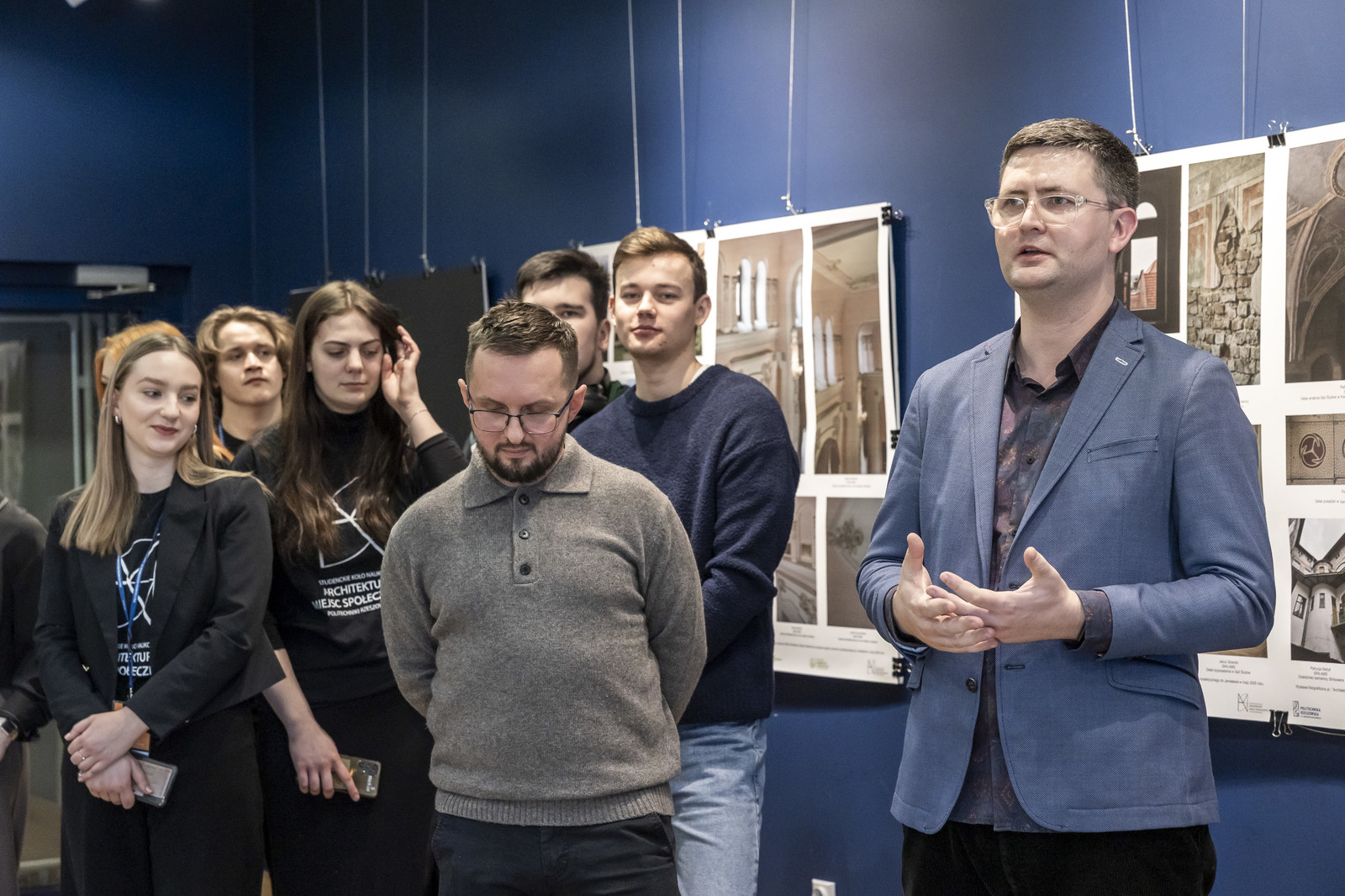 Uroczyste otwarcie wernisażu wystawy fotograficznej „Architektura Jarosławia” odbyło się 21 stycznia 2026 r. w Galerii P_okaz. Spotkanie rozpoczęto oficjalnym powitaniem zaproszonych gości podczas którego Dziekan WBIŚIA prof. dr hab. inż. Lech Lichołai wyraził podziękowania dla organizatorów wydarzenia. Dr inż. arch. Beata Walicka-Góral przywitała wszystkich obecnych i przedstawiła przybyłych gości oraz podziękowała wszystkim za przybycie. Podziękowała członkom Koła Architektury Miejsc Społecznych za ogromne zaangażowanie w przygotowanie wystawy i osobom dzięki którym mogły powstać zdjęcia prezentowane na wystawie. Wśród nich wymieniła Aleksandra Busza, Damiana Pękalskiego oraz Przemysława Gąsiorskiego pracowników Wojewódzkiego Urzędu Ochrony Zabytków i członków Przemyskiego Towarzystwa Kulturalnego.