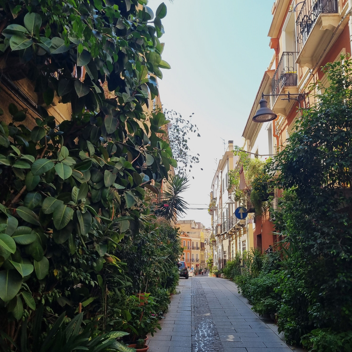 Opis do zdjęcia: Na rynku Cagliari zieleni jest bardzo mało a ciasne uliczki powodują dodatkowy problem z planowaniem zielonych przestrzeni wspólnych. Przechadzając się po tym miejscu urzekła mnie uliczka i zaradność tamtejszych mieszkańców na problem braku zieleni w mieście. Lokatorzy tamtejszych bloków wystawiają liczne rośliny w doniczkach na surowym chodniku, tworząc przyjazny mikroklimat wnętrza ulicy.