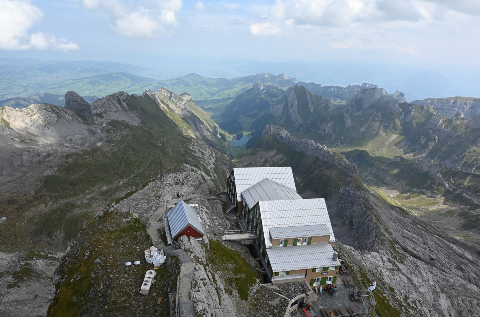 Opis do zdjęcia: Zdjęcie przedstawia Berggasthaus Alter Säntis – pensjonat ze schroniskiem, hotelem i restauracją, położony na najwyższym szczycie Alp Appenzellskich, który wznosi się na wysokość 2502 m n.p.m.